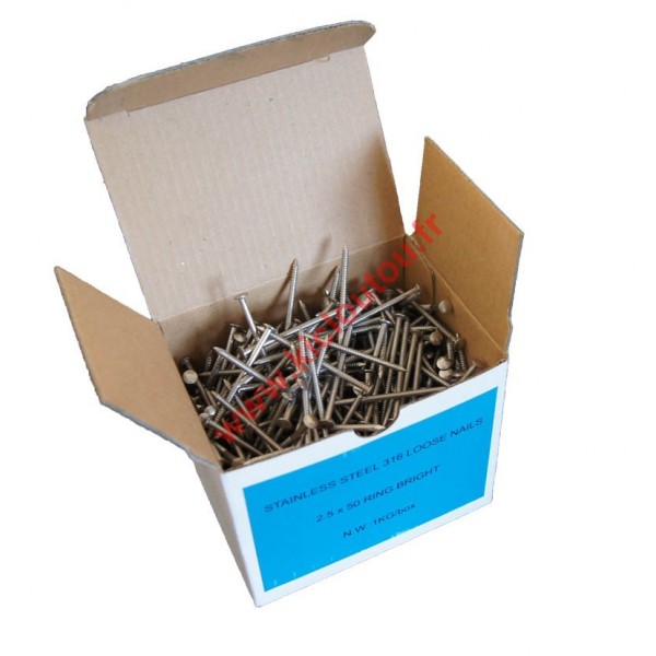 Descriptif du produit :Boite de 1Kg (625 pointes environs) de clous inox A4 de 2.5x45 mm crantés tête bombée