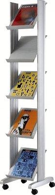 Descriptif du produit :Existe en modèle simple ou triple faceStructure acier laqué époxy gris aluminium, habillée de polystyrène et équipée de 4 roulettes pivotantes5 tablettes de présentation en ABS gris alu Réglables tous les 2 cm et orientables à 0-45-75°Hauteur 33 cm avec rebord de 4 cm pour le maintien des documentsL/H/P : 35 x 167,5 x 38,5 cmLivré prêt à monter avec notice