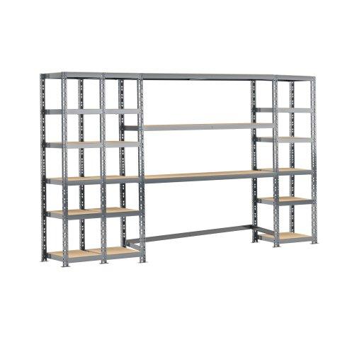 - Concept rangement de garage MODULÖ STORAGE SYSTEME EXTENSION 4 étagères 21 plateaux longueur 300 cmEtagère quadruple charge lourde 21 plateaux longueur 300 cm comprenant 3 étagères charge lourde 6 plateaux 40x50xH 192 cm et une étagère rack 3 plateaux 40x150xH 192 cm livrée avec montants de renfort au sol anti-écartement - Charge lourde 250 kg/plateau - Montage facile par clipsage - Finition peinture époxy Utilisation concept rangement complet pour le garage permettant sur une longueur de 300 cm de ranger des petits produits comme les produits alimentaires, chaussures, livres, et des gros produits volumineux, des produits lourds.• idéal pour utiliser l'espace au mur, même sur de petites surfaces,• très fonctionnel, il permet d'optimiser le rangement des produits petits, moyens, gros et volumineux.• modulable en hauteur grâce à ses plateaux amovibles,• énorme capacité de charge de 5250 kg, répartie jusqu'à 250 kg par plateau,• grande résistance dans les endroits humides,• montage rapide, sans vis ni boulon grâce à sa conception innovante d'extension des 2 côtés.Possibilité d'extension permanente avec toutes les extensions MODULÖ STORAGE.Livraison en France métropolitaine uniquement (hors îles et Corse). Livraison en bas de l'immeuble. Si vous souhaitez la livraison à l'étage et la prestation montage, contactez-nous par e-mail à mybruneau@bruneau.fr pour un devis global.