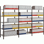 Rayonnage acier finition peinture époxy anthracite RAL 7024, sans croisillon arrière, pour une utilisation double-face. Haut. 200 cm (avec pieds plastique).Capacité de charge : jusqu\'à 235 kg par tablette (uniformément répartis).Poteaux profilés T (4x3,7cm), esthétique, sans perforation en façade, avec niveaux réglable au pas de 4 cm. Profondeurs des tablettes adaptées au stockage de boîtes à archives : 70 cm en double-face. Tablettes tubulaires gris RAL 7035 s\'enclenchant directement dans les perforations latérales des poteaux : 2 tubes centraux pour prof. 70 cm.Largeur tablette (hors montants) : 125 cm.Conforme aux EUROCODES III et recommandations FEM 10.2.06.