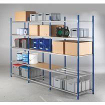 Grande modularité pour composer des configurations de stockage sur mesure. Montage facile, sans vis ni outils. Structure : tôle d’acier galvanisé 10/10e. Montants laqués époxy bleu RAL 5010 ou gris anthracite RAL 7016.