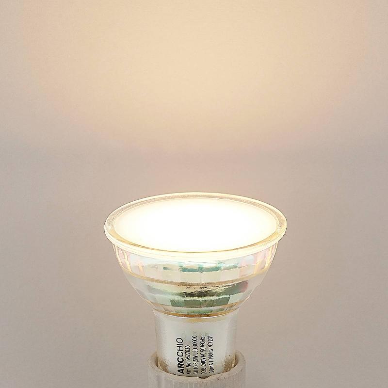 Descriptif du produit :Réflecteur LED GU10 3,4W en verre, blanc chaud 3.000K Le réflecteur LED, composé de verre avec une lentille en polycarbonate, fournit un éclairage blanc chaud, diffusé sur un large angle de 120°. Le réflecteur n\'est pas à intensité variable.