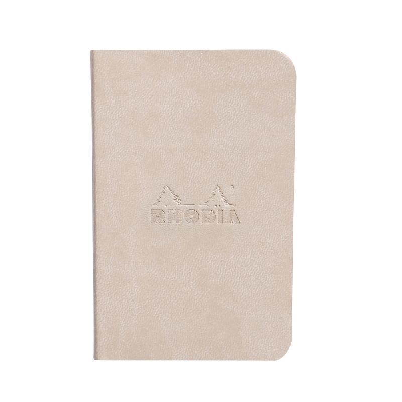Couverture souple en simili cuir italien, logo Rhodia embossé, dos carré collé.