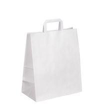Poignées plates haute résistance. Sac papier kraft blanc 80 g/m2. Poignées plates. Dimensions : H 40 x L 32 x P 15 cm. Carton de 50 sacs. Délai de livraison : 1