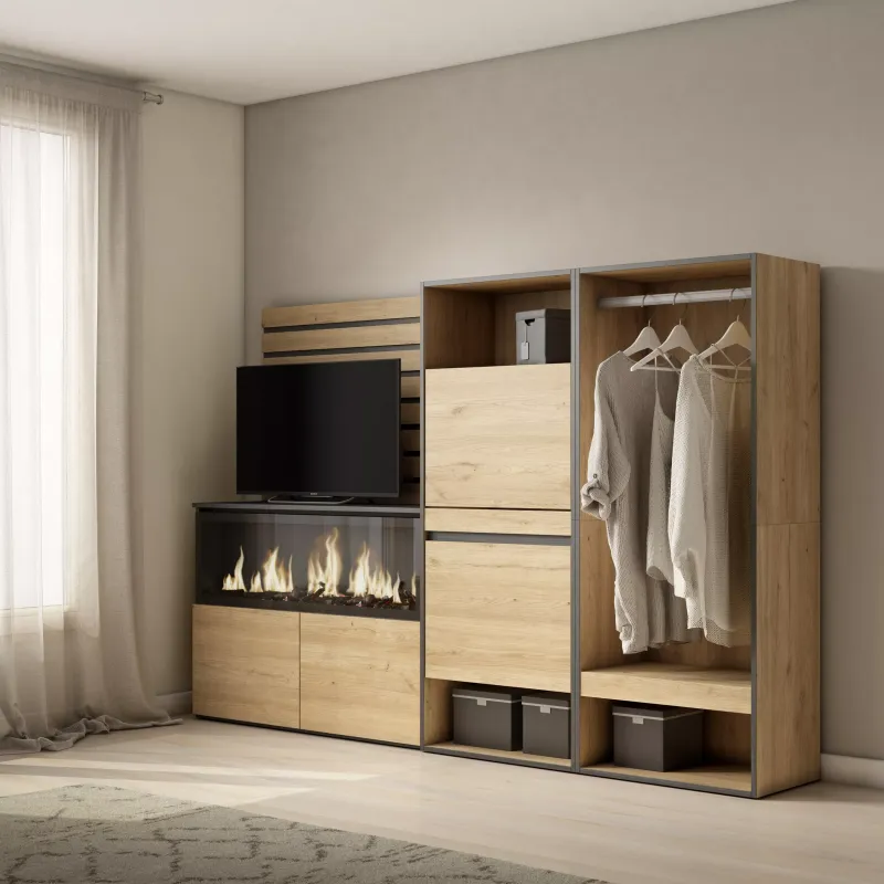 Module avec 2 portes, grande capacité de rangement. Dimensions du module: 107 x 75 x 35 cm (largeur x hauteur x profondeur). Couleur chêne et noir avec un veinage du bois poreux au touché de haute qualité.