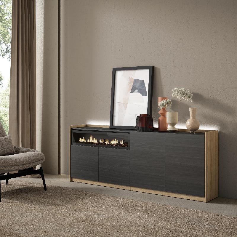 SKRAUT HOME - BUFFET EFFET BOIS NOIR ET CHÊNE 207X37X80CM CHEMINÉE EFFET FEU