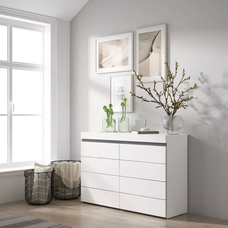 Descriptif du produit :Commode composée de 4 tiroirs. Grande capacité de rangement. Élégant et pratique, avec ouverture à pression. Style moderne. Dimensions: 56,7 x 33 x 75 cm (largeur x profondeur x hauteur). Couleur blanc et noir avec un veinage du bois poreux au touché de haute qualité.