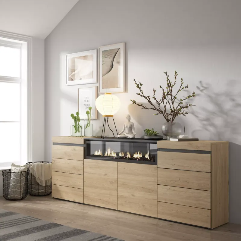 Module avec 2 portes, grande capacité de rangement. Dimensions du module: 102 x 75 x 35 cm (largeur x hauteur x profondeur). Couleur chêne et noir avec un veinage du bois poreux au touché de haute qualité.