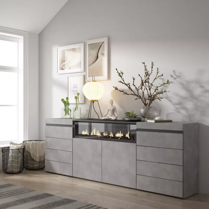 Module avec 2 portes, grande capacité de rangement. Dimensions du module: 102 x 75 x 35 cm (largeur x hauteur x profondeur). Couleur ciment et noir avec un veinage du bois poreux au touché de haute qualité.