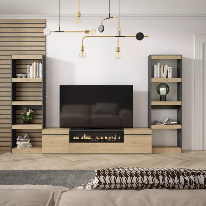 Meuble TV avec espace de rangement pour vos appareils électroniques et porte rabattable. Dimensions du module: 102 cm. de largeur, 45 cm. de hauteur, 35 cm. de profondeur. Couleur chêne et noir avec un veinage du bois poreux au touché de haute qualité.