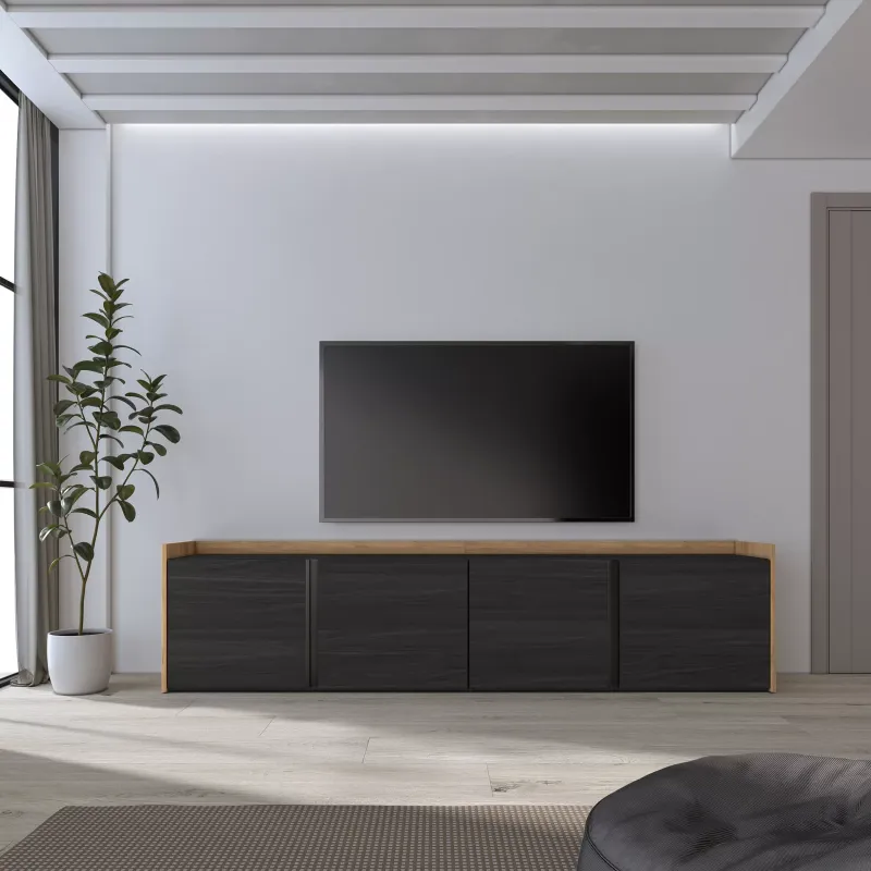 Descriptif du produit :Module TV avec portes battantes et grande capacité de rangement. Dimensions du module : 104 cm de largeur, 50 cm de hauteur, 35 cm de profondeur. Couleur noir et chêne avec veinures en bois poreux de haute qualité.