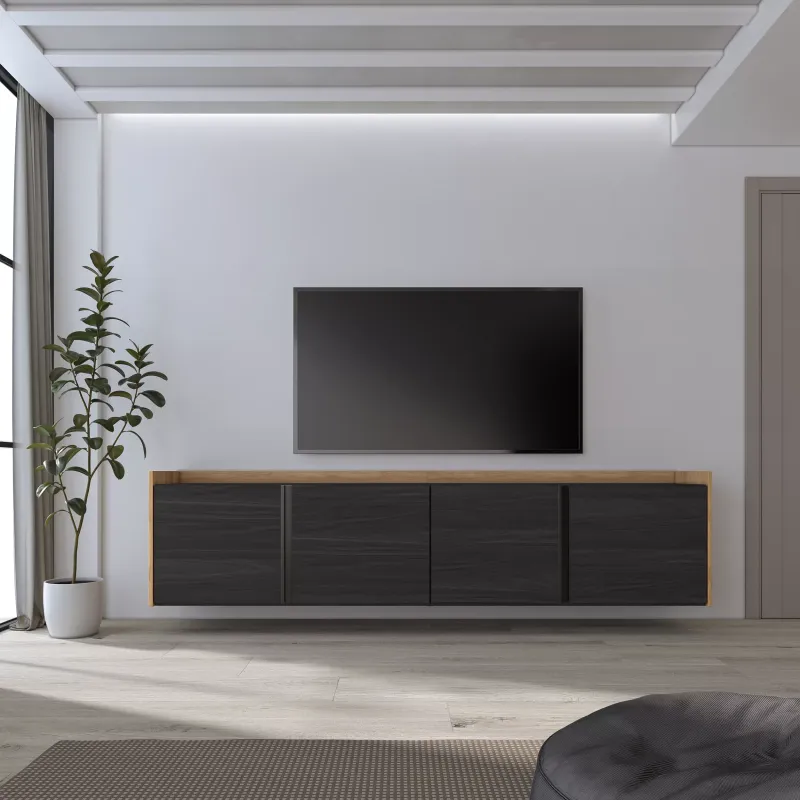 SKRAUT HOME - MEUBLE TV, BANC TéLé, 207X35X50CM, POUR LES TV JUSQU'à 80", SUSPENDU, MURAL, NOIR ET CHêNE