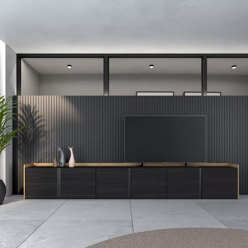 Descriptif du produit :Module TV avec portes battantes et grande capacité de rangement. Dimensions du module : 104 cm de largeur, 50 cm de hauteur, 35 cm de profondeur. Couleur noir et chêne avec veinures en bois poreux de haute qualité.