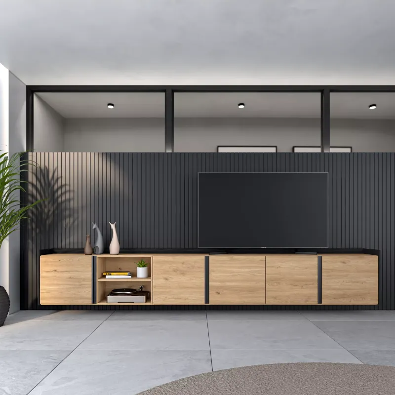 Descriptif du produit :Module TV avec portes battantes et grande capacité de rangement. Dimensions du module : 104 cm de largeur, 50 cm de hauteur, 35 cm de profondeur. Couleur chêne et noir avec veinures en bois poreux de haute qualité. Meuble TV avec espace de rangement pour vos appareils électroniques et porte rabattable. Dimensions du module: 104 cm. de largeur, 50 cm. de hauteur, 35 cm. de profondeur. Couleur ...