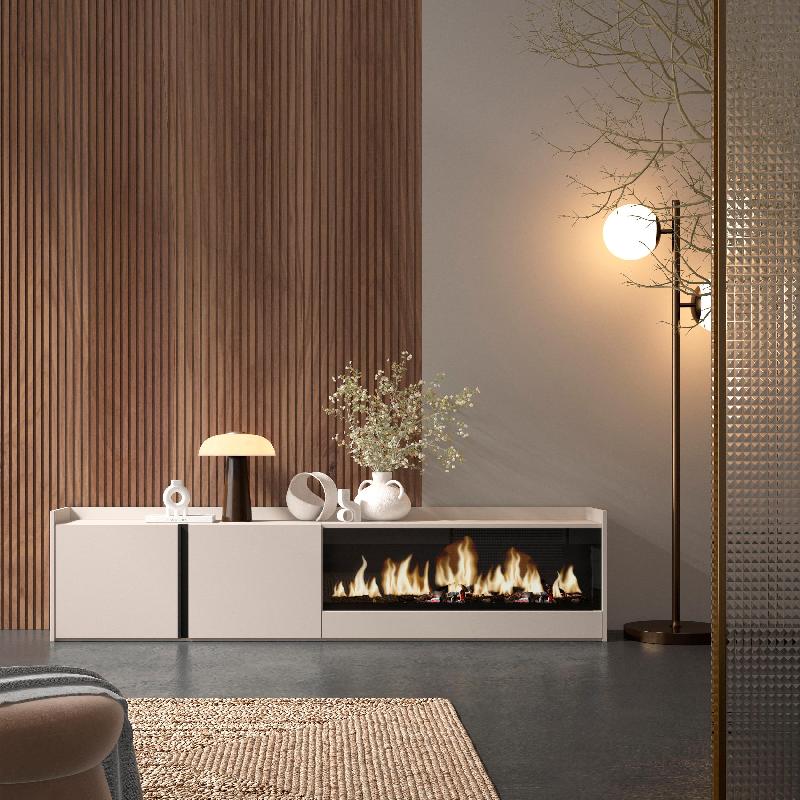 Module TV avec ouverture. Dimensions du module : 109 cm de largeur, 50 cm de hauteur, 35 cm de profondeur. Couleur beige. Module TV avec portes battantes et grande capacité de rangement. Charnières avec fermeture soft. Poignées en aluminium. Dimensions du module : 103 cm de largeur, 50 cm de hauteur, 35 cm de profondeur. Couleur beige Cheminée électrique à LED. Dimensions: 107cm de large, 32cm de haut. Effet de feu 3D incroyablement réaliste. Pas de risque de brûlure car il n'y a pas de source de chaleur. Puissance: 34w. Comprend une télécommande et 3 niveaux d'intensité. La cheminée électrique fonctionne branchée à l'électricité, et ne comprend pas de piles. La télécommande fonctionne avec des piles, non incluses.