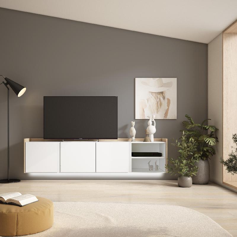 SKRAUT HOME - MEUBLE TV EFFET BOIS BLANC ET CHÊNE 207X35X50CM SUSPENDU