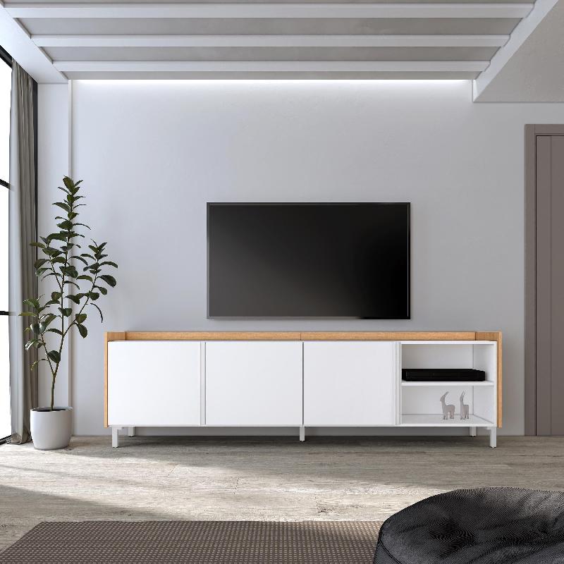 Descriptif du produit :Module TV avec portes battantes et grande capacité de rangement. Charnières avec fermeture soft. Poignées en aluminium. Dimensions du module : 103 cm de largeur, 50 cm de hauteur, 35 cm de profondeur. Couleur blanc mat et chêne clair avec veinage bois au toucher poreux de haute qualité. Module TV avec espace de rangement pour vos appareils électroniques et porte rabattable. Charnières avec ...