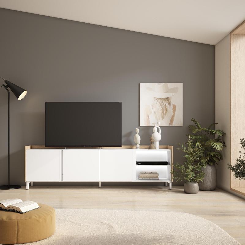 SKRAUT HOME - MEUBLE TV EFFET BOIS BLANC ET CHÊNE 207X35X61CM AVEC PIEDS