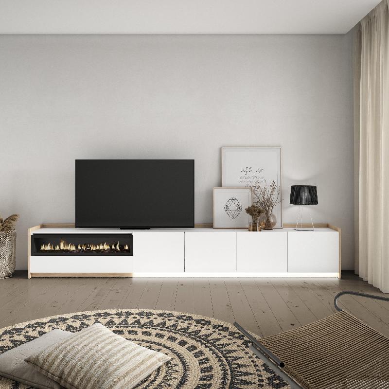 Module TV avec portes battantes et grande capacité de rangement. Charnières avec fermeture soft. Dimensions du module : 104 cm de largeur, 50 cm de hauteur, 37 cm de profondeur. Couleur blanc mat et chêne clair avec veinures en bois poreux de haute qualité.