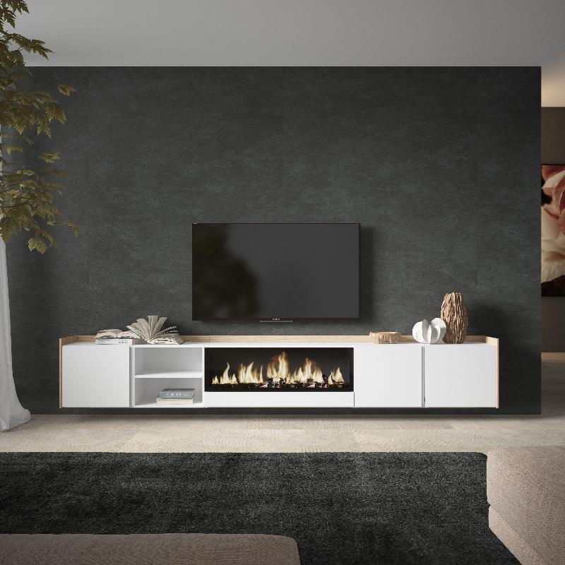 Module TV avec ouverture. Dimensions du module : 109 cm de largeur, 50 cm de hauteur, 35 cm de profondeur. Couleur blanc mat et chêne clair avec veinage du bois à texture poreuse de haute qualité.