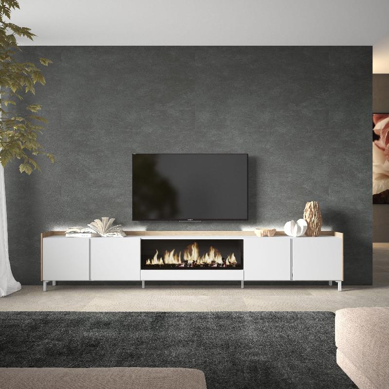 SKRAUT HOME - MEUBLE TV EFFET BOIS BLANC ET CHÊNE 315X35X61CM CHEMINÉE EFFET FEU XXL