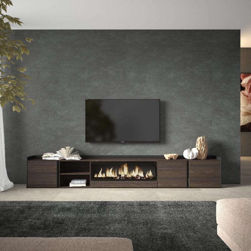 Module TV avec espace de rangement pour vos appareils électroniques et porte rabattable. Charnières avec fermeture soft. Poignées en aluminium. Dimensions du Module : 103 cm de largeur, 50 cm de hauteur, 35 cm de profondeur. Couleur chêne foncé et noir avec veinures en bois poreux de haute qualité.
