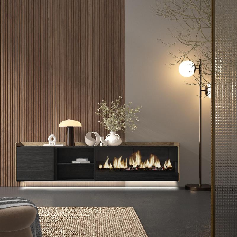 Module TV avec espace de rangement pour vos appareils électroniques et porte rabattable. Charnières avec fermeture soft. Poignées en aluminium. Dimensions du module: 103 cm. de largeur, 50 cm. de hauteur, 35 cm. de profondeur. Couleur noir et chêne avec un veinage du bois poreux au touché de haute qualité.