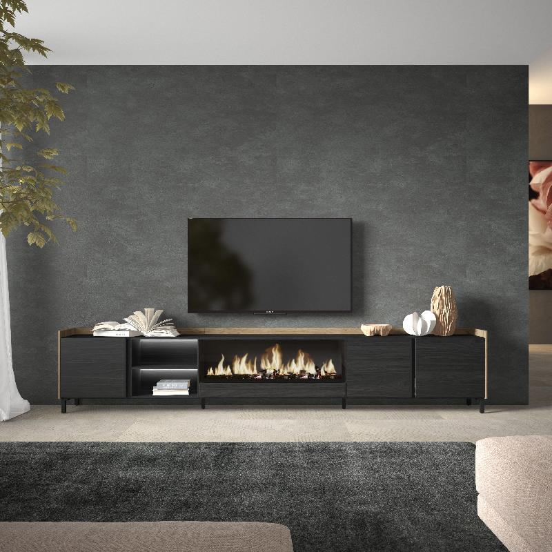 Module TV avec espace de rangement pour vos appareils électroniques et porte rabattable. Charnières avec fermeture soft. Poignées en aluminium. Dimensions du module: 103 cm. de largeur, 50 cm. de hauteur, 35 cm. de profondeur. Couleur noir et chêne avec un veinage du bois poreux au touché de haute qualité.