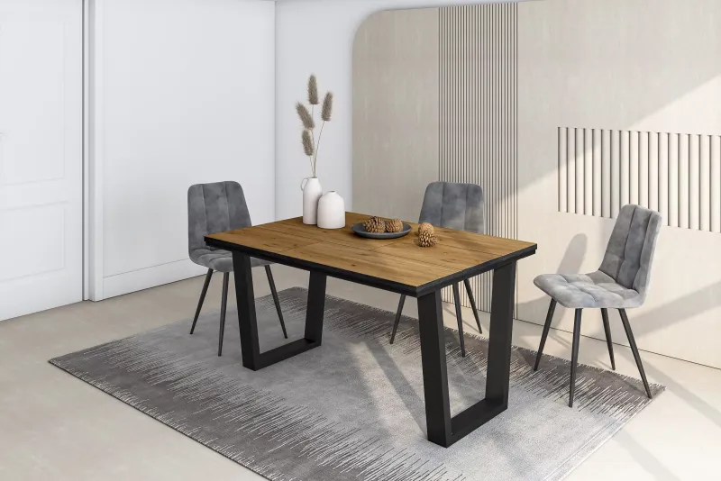 Table à manger fabriquée avec un plateau en mélamine de haute qualité de 30 mm. Couleur chêne et noir avec un grain de bois poreux de haute qualité. Idéale pour les réunions de famille, elle est également parfaite pour les fêtes et les événements. Cette table multifonctionnelle peut également être utilisée comme table de travail, bureau ou table d'appoint dans votre salon, grâce à sa taille. Avec des pieds en métal en forme de U, qui garantissent une table robuste et stable. Couleur noire. 80x40 mm. Avec un design élégant de style industriel, la combinaison du métal et du bois apporte une touche rustique et naturelle à votre intérieur. Pour 6 personnes 140x90x74 cm