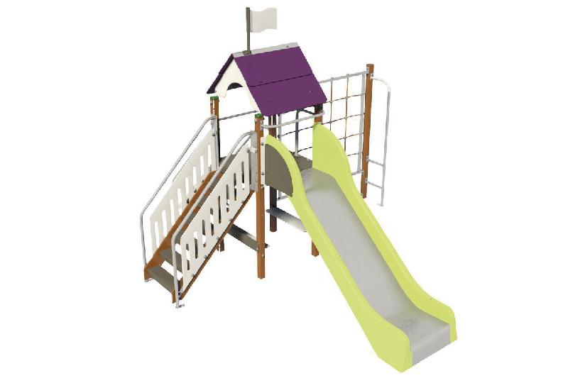 Poteaux et traverses en bois massif traité autoclave classe IV avec 2 couches de lasure coloris taupe.Section 7 x 7 cmPanneau en HPLPlancher, rampe et marches en panneau multiplis revêtu d’un film antidérapantEléments métalliques en acier revêtus d’une laqueFixations au sol en acier galvaniséVisserie inox et zinguéeJeu conçu en référence à la réglementation ainsi qu’aux normes d ...