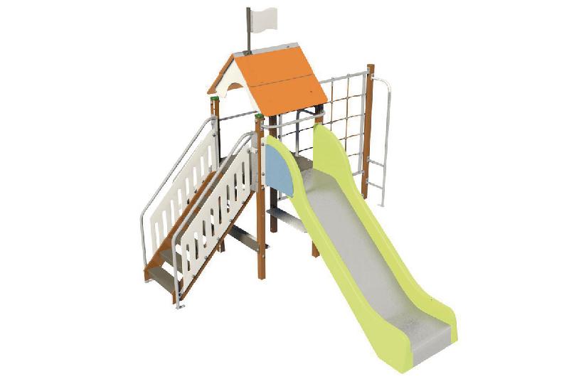 Descriptif du produit :Poteaux et traverses en bois massif traité autoclave classe IV avec 2 couches de lasure coloris taupe.Section 7 x 7 cmPanneau en HPLPlancher, rampe et marches en panneau multiplis revêtu d’un film antidérapantEléments métalliques en acier revêtus d’une laqueFixations au sol en acier galvaniséVisserie inox et zinguéeJeu conçu en référence à la réglementation ainsi qu’aux normes d ...