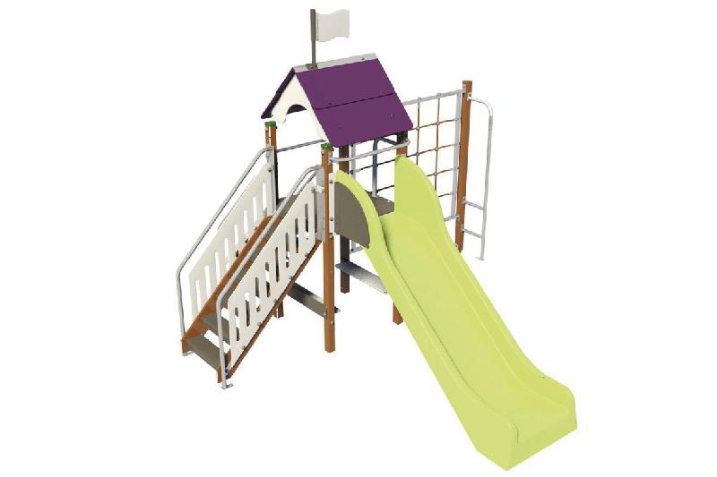 Poteaux et traverses en bois massif traité autoclave classe IV avec 2 couches de lasure coloris taupe.Section 7 x 7 cmPanneau en HPLPlancher, rampe et marches en panneau multiplis revêtu d’un film antidérapantEléments métalliques en acier revêtus d’une laqueFixations au sol en acier galvaniséVisserie inox et zinguéeJeu conçu en référence à la réglementation ainsi qu’aux normes d ...