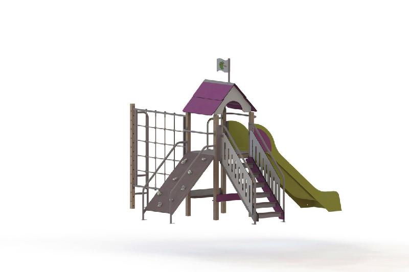 Poteaux et traverses en bois massif traité autoclave classe IV avec 2 couches de lasure coloris taupe.Section 7 x 7 cmPanneau en HPLPlancher, rampe et marches en panneau multiplis revêtu d’un film antidérapantEléments métalliques en acier revêtus d’une laqueFixations au sol en acier galvaniséVisserie inox et zinguéeJeu conçu en référence à la réglementation ainsi qu’aux normes d ...