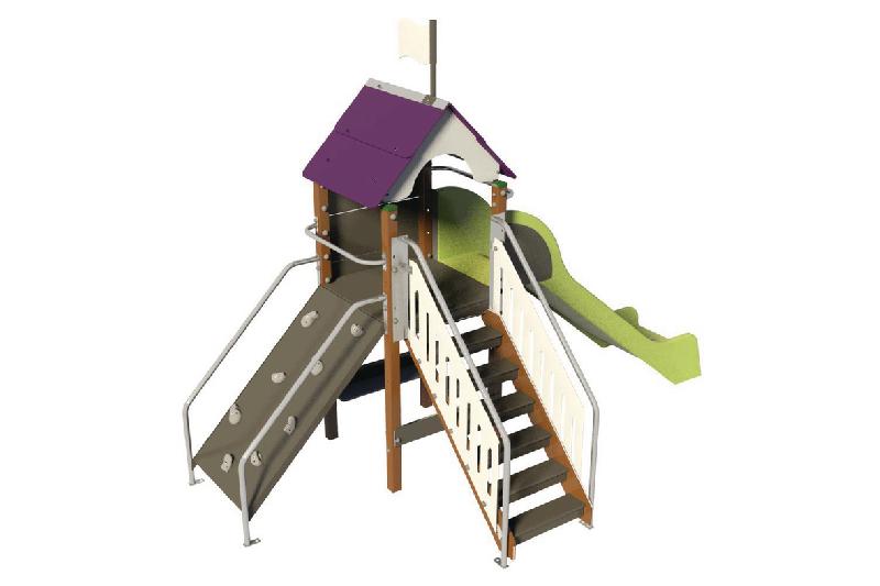 Poteaux et traverses en bois massif traité autoclave classe IV avec 2 couches de lasure coloris taupe.Section 7 x 7 cm.Panneau en HPLPlancher, rampe et marches en panneau multiplis revêtu d’un film antidérapantEléments métalliques en acier revêtus d’une laqueFixations au sol en acier galvaniséVisserie inox et zinguéeJeu conçu en référence à la réglementation ainsi qu’aux normes ...