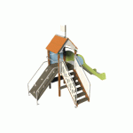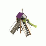 Poteaux et traverses en métalPanneau en HPLPlancher, rampe et marches en panneau multiplis revêtu d’un film antidérapantEléments métalliques en acier revêtus d’une laqueFixations au sol en acier galvaniséVisserie inox et zinguéeJeu conçu en référence à la réglementation ainsi qu’aux normes de la série NF EN 1176 et 1177
