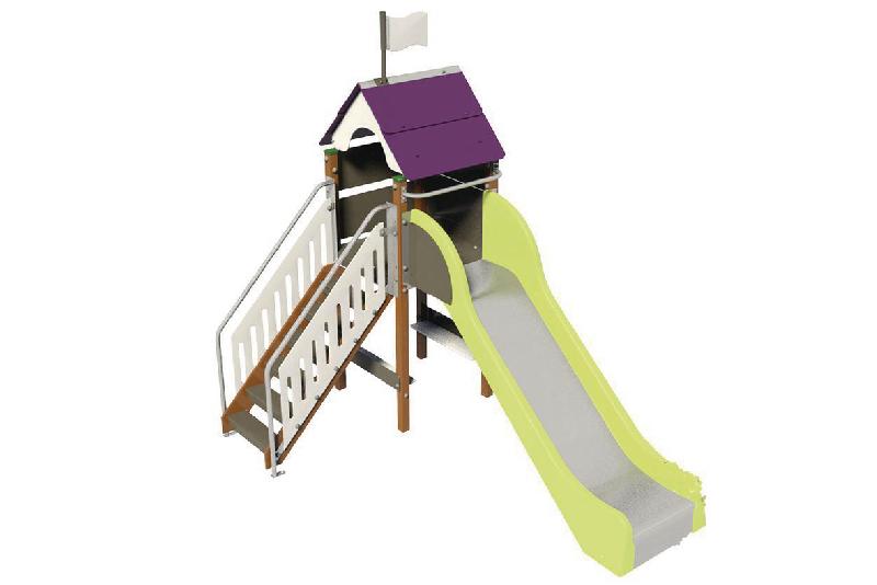 Poteaux et traverses en bois massif traité autoclave classe IV avec 2 couches de lasure coloris taupe.Section 7 x 7 cm.Panneau en HPLPlancher, rampe et marches en panneau multiplis revêtu d’un film antidérapantEléments métalliques en acier revêtus d’une laqueFixations au sol en acier galvaniséVisserie inox et zinguéeJeu conçu en référence à la réglementation ainsi qu’aux normes ...