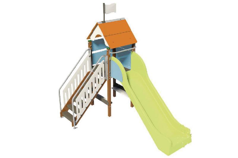 Poteaux et traverses en bois massif traité autoclave classe IV avec 2 couches de lasure coloris taupe.Section 7 x 7 cm.Panneau en HPLPlancher, rampe et marches en panneau multiplis revêtu d’un film antidérapantEléments métalliques en acier revêtus d’une laqueFixations au sol en acier galvaniséVisserie inox et zinguéeJeu conçu en référence à la réglementation ainsi qu’aux normes ...