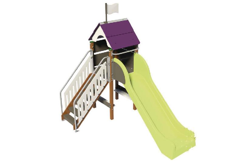 Descriptif du produit :Poteaux et traverses en bois massif traité autoclave classe IV avec 2 couches de lasure coloris taupe.Section 7 x 7 cm.Panneau en HPLPlancher, rampe et marches en panneau multiplis revêtu d’un film antidérapantEléments métalliques en acier revêtus d’une laqueFixations au sol en acier galvaniséVisserie inox et zinguéeJeu conçu en référence à la réglementation ainsi qu’aux normes ...