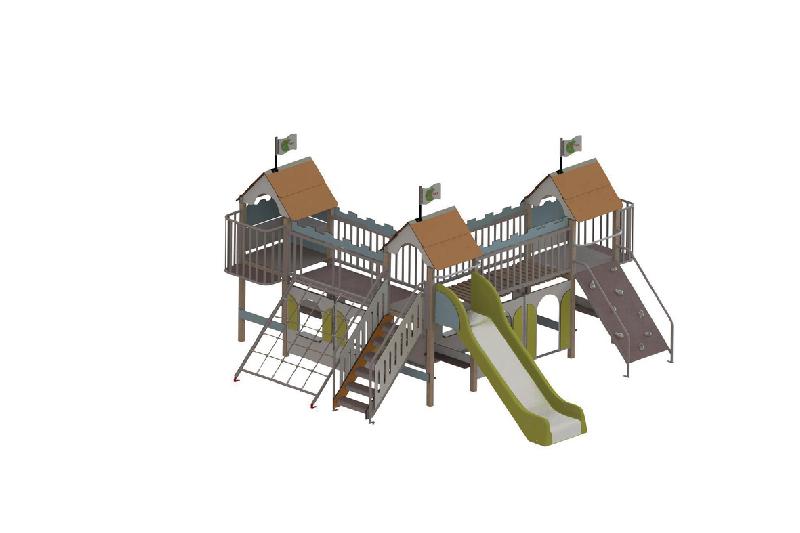 Poteaux et traverses en pin massif traité autoclave classe IV avec 2 couches de lasure.Section 7 x 7 cmPanneau en HPLPlancher, rampe et marches en panneau multiplis revêtu d’un film antidérapantEléments métalliques en acier revêtus d’une laqueFixations au sol en acier galvaniséVisserie inox et zinguéeJeu conçu en référence à la réglementation ainsi qu’aux normes de la série NF ...