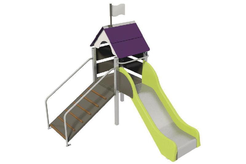 Poteaux et traverses en métalPanneau en HPLPlancher, rampe et marches en panneau multiplis revêtu d’un film antidérapantEléments métalliques en acier revêtus d’une laqueFixations au sol en acier galvaniséVisserie inox et zinguéeJeu conçu en référence à la réglementation ainsi qu’aux normes de la série NF EN 1176 et 1177