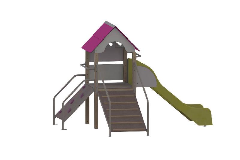 Poteaux et traverses en pin massif traité autoclave classe IV avec 2 couches de lasure.Section 7 x 7 cm.Panneau en HPLPlancher, rampe et marches en panneau multiplis revêtu d’un film antidérapantEléments métalliques en acier revêtus d’une laqueFixations au sol en acier galvaniséVisserie inox et zinguéeJeu conçu en référence à la réglementation ainsi qu’aux normes de la série NF ...