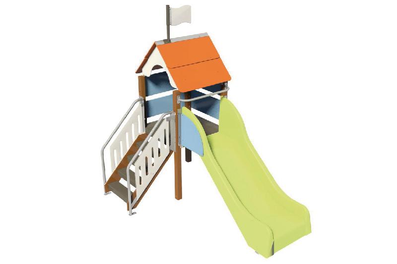 Poteaux et traverses en bois massif traité autoclave classe IV avec 2 couches de lasure coloris taupe.Section 7 x 7 cm.Panneau en HPLPlancher, rampe et marches en panneau multiplis revêtu d’un film antidérapantEléments métalliques en acier revêtus d’une laqueFixations au sol en acier galvaniséVisserie inox et zinguéeJeu conçu en référence à la réglementation ainsi qu’aux normes ...