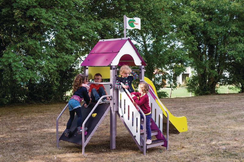 Descriptif du produit :Poteaux et traverses en acier galvanisé laqué peint avec 2 couches de lasure coloris taupe. Section 70 x 70 mm.Panneau en HPLPlancher, rampe et marches en panneau multiplis revêtu d’un film antidérapantEléments métalliques en acier revêtus d’une laqueFixations au sol en acier galvaniséVisserie inox et zinguéeJeu conçu en référence à la réglementation ainsi qu’aux normes de la ...