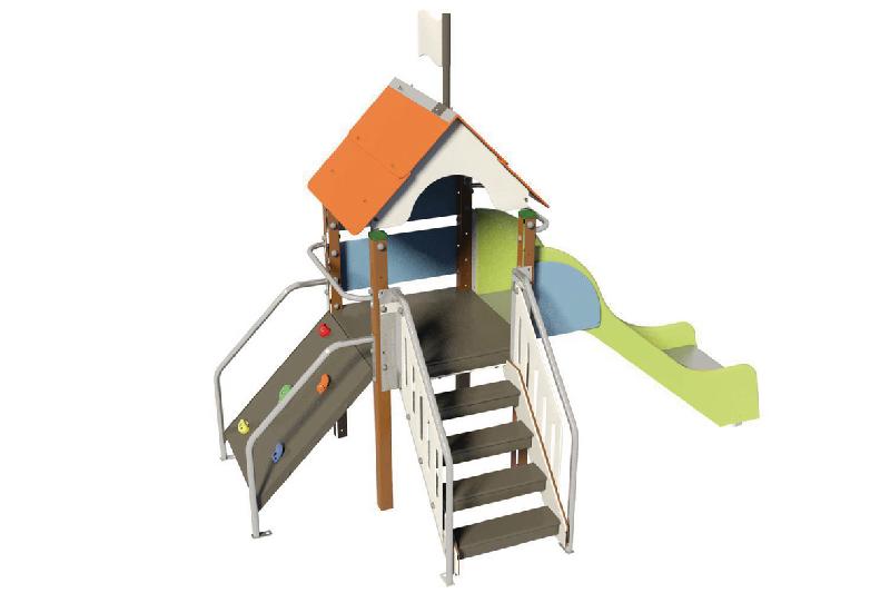 Poteaux et traverses en bois massif traité autoclave classe IV avec 2 couches de lasure coloris taupe.Section 7 x 7 cm.Panneau en HPLPlancher, rampe et marches en panneau multiplis revêtu d’un film antidérapantEléments métalliques en acier revêtus d’une laqueFixations au sol en acier galvaniséVisserie inox et zinguéeJeu conçu en référence à la réglementation ainsi qu’aux normes ...