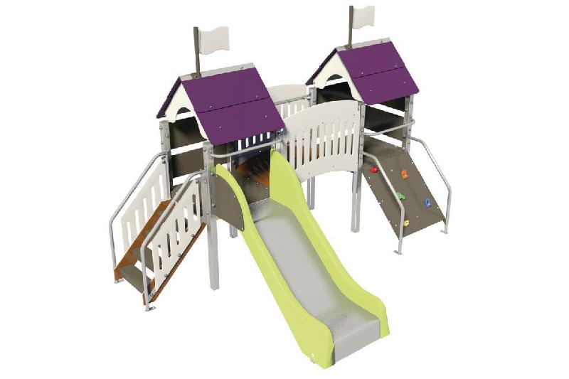 Poteaux et traverses en métalPanneau en HPLPlancher, rampe et marches en panneau multiplis revêtu d’un film antidérapantEléments métalliques en acier revêtus d’une laqueFixations au sol en acier galvaniséVisserie inox et zinguéeJeu conçu en référence à la réglementation ainsi qu’aux normes de la série NF EN 1176 et 1177
