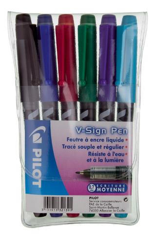 Descriptif du produit :- Le V-Sign Pen est un feutre encre liquide à pointe moyenne doté d'un régulateur pour un débit d'encre parfait. Le niveau de son encre est visible. Le V-Sign Pen vous séduira par la souplesse de son tracé et sa grande longévité.Grâce à son capuchon avec clip plastique, vous pouvez l’accrocher à votre poche ou à un support d’écriture. En polyacétate baguée, la pointe de 2 mm ré ...
