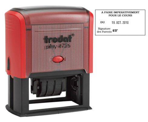 Descriptif du produit :- Optez pour le tampon dateur Printy 4726 Trodat pour apposer une même information sur de nombreux documents. empreinte 75 x 38 mmhauteur de la date : 4 mmune plaque personnalisable en caoutchouc avec la date (réglable par molette) et un texte de 6 lignes avec ou sans logo (option gratuite) fenêtre de visualisation pour avoir un aperçu de l’empreinte avant de marquer le document.encre monoch ...
