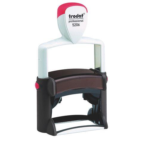 Descriptif du produit :- Le tampon encreur Trodat Professional Line 5206 est idéal pour un usage professionnel et peut être utilisé en cachet commercialen acier inoxydable encrage automatique livré avec une cassette d'encre noire Trodat Professional line 6/56. monture métallique grainée plastiqueplaque en caoutchouc 56 x 33 mmjusqu'à 8 lignes de texte et logo.