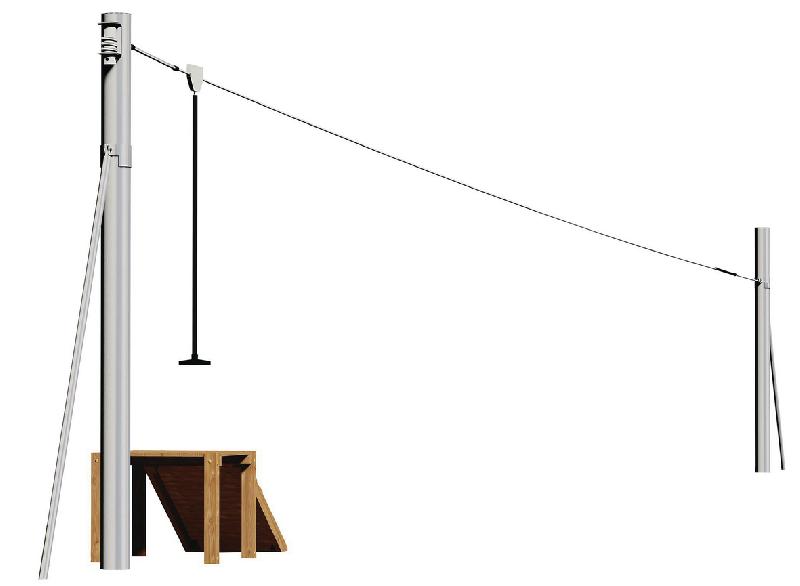 Descriptif du produit :2 montants verticaux en acier galvanisé de Ø 220 mm.Ces montants sont à implanter sur des hauteurs différentes et sont soutenus par des poteaux inclinés de Ø 60 mm en acier galvanisé.Système coulissant avec cordage en acier galvanisé composé de plusieurs toronsA chaque extrémité se trouve un dispositif d’arrêt élastique.2 tourelles découvertes avec montants en bois de section 9 x ...