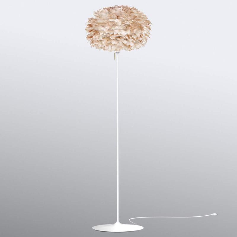 Un abat-jour marron clair en plumes orne le lampadaire Eos medium L\'abat-jour inhabituel en plumes du designer Søren Ravn Christensen et le pied de sol d\'Anders Klem, d\'une beauté intemporelle, forment une symbiose d\'un genre particulier pour le lampadaire Eos medium : La sobriété du piètement blanc élancé ne détourne en rien l\'attention de l\'aspect extravagant de l\'abat-jour. Il est composé d\'environ 1800 plumes d\'oie marron clair, collées sur une base en papier, ce qui donne un abat-jour qui dessine la lumière émise de manière particulièrement douce. Le lampadaire Eos medium s\'allume à l\'aide d\'un élégant interrupteur en laiton qui se trouve sous la douille sur la structure et constitue un accessoire décoratif supplémentaire. Un lampadaire qui s\'intègre parfaitement dans le portefeuille de produits de l\'entreprise de luminaires danoise UMAGE, dont la prémisse dans la fabrication de luminaires est le développement du design scandinave. - Si l\'abat-jour est sale, il suffit d\'enlever la poussière avec un sèche-cheveux. - Aucune plume d\'animal vivant n\'est utilisée.